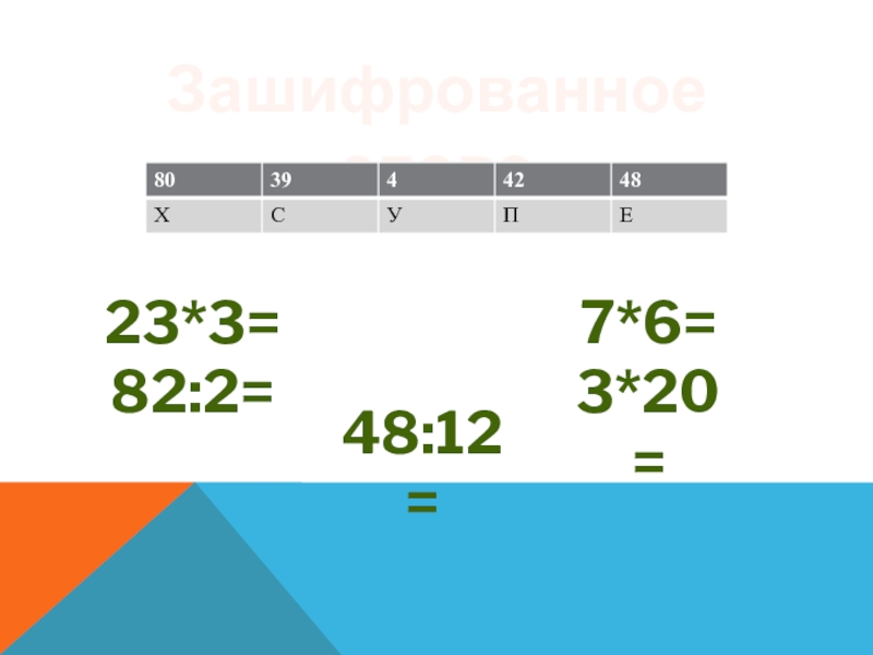 Зашифрованное слово23*3=82:2=7*6=3*20=48:12=