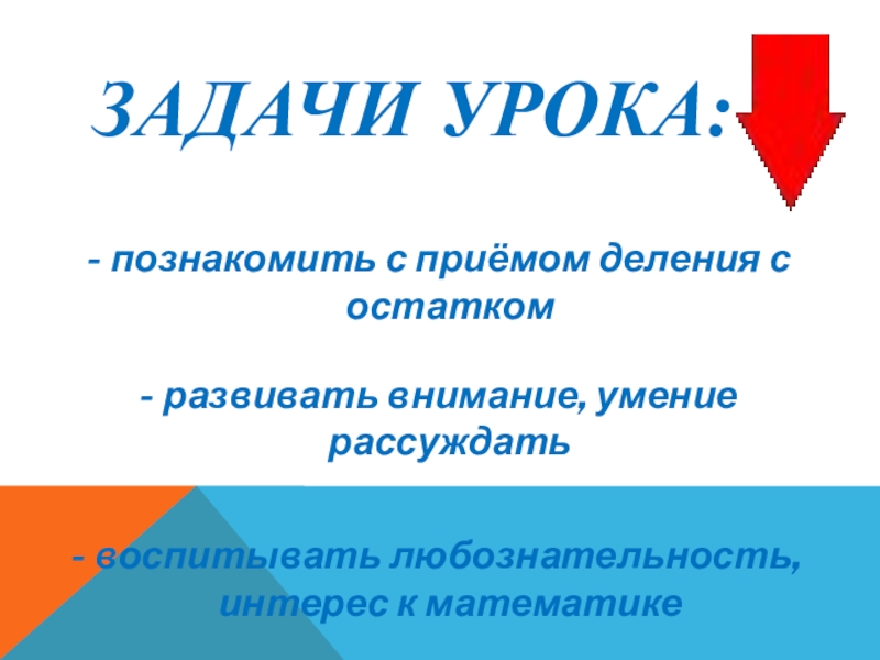 Задачи урока: - познакомить с приёмом деления с остатком - развивать внимание, умение рассуждать- воспитывать любознательность, интерес к математике