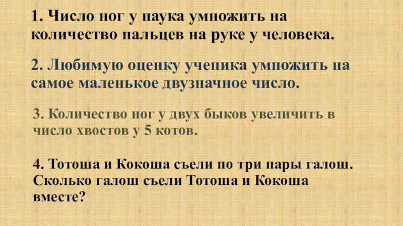 3. Количество ног у двух быков увеличить в число хвостов у 5 котов.