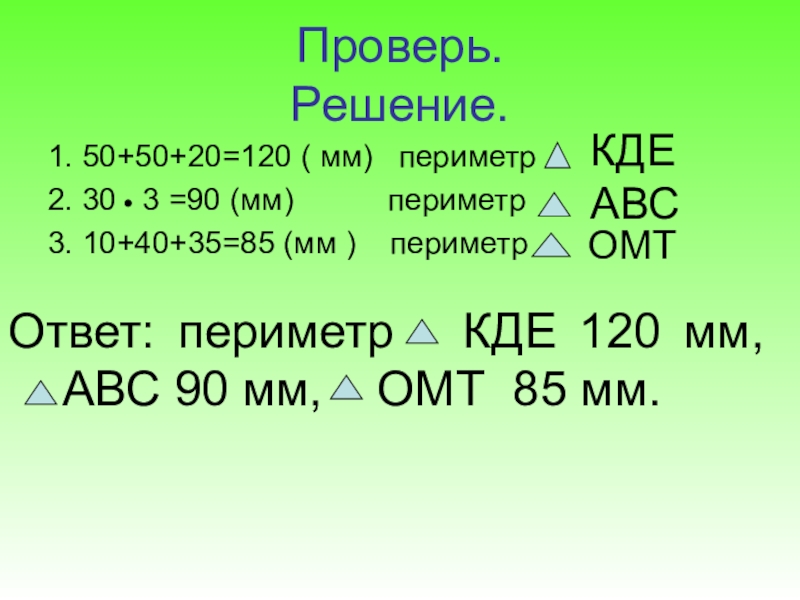 Ответ: периметр КДЕ 120 мм, АВС 90 мм, ОМТ 85 мм.