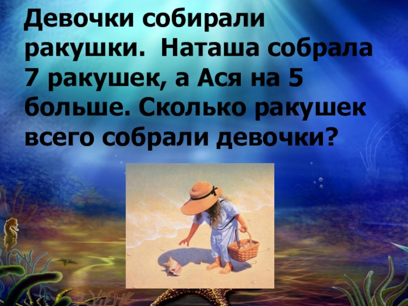 Слайд 12Девочки собирали ракушки. Наташа собрала 7 ракушек, а Ася на 5