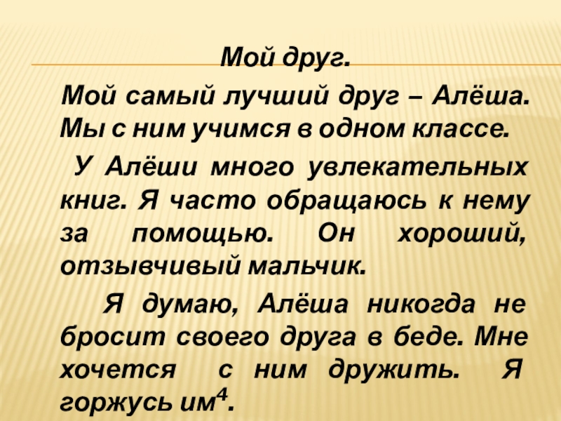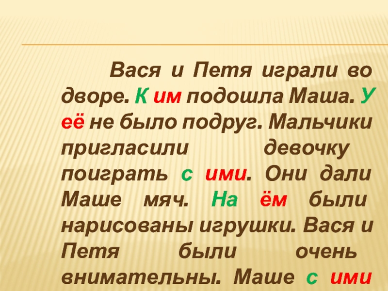 Вася и Петя играли во дворе. К им подошла Маша. У её не было подруг. Мальчики пригласили девочку поиграть с ими. Они дали Маше мяч. На ём были нарисованы игрушки. Вася и Петя были очень внимательны. Маше с ими весело.