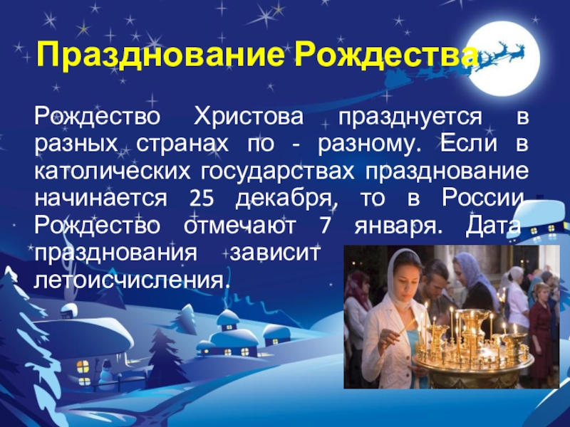 в католических государствах празднование начинается 25 декабря, то в России Рождество отмечают 7 января. Дата празднования зависит от календаря летоисчисления.