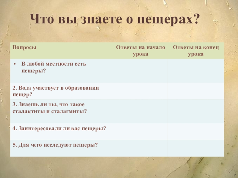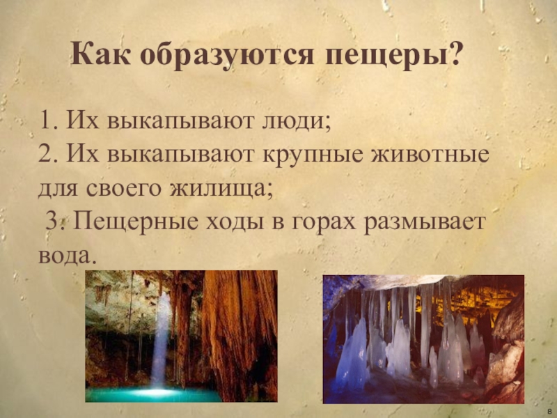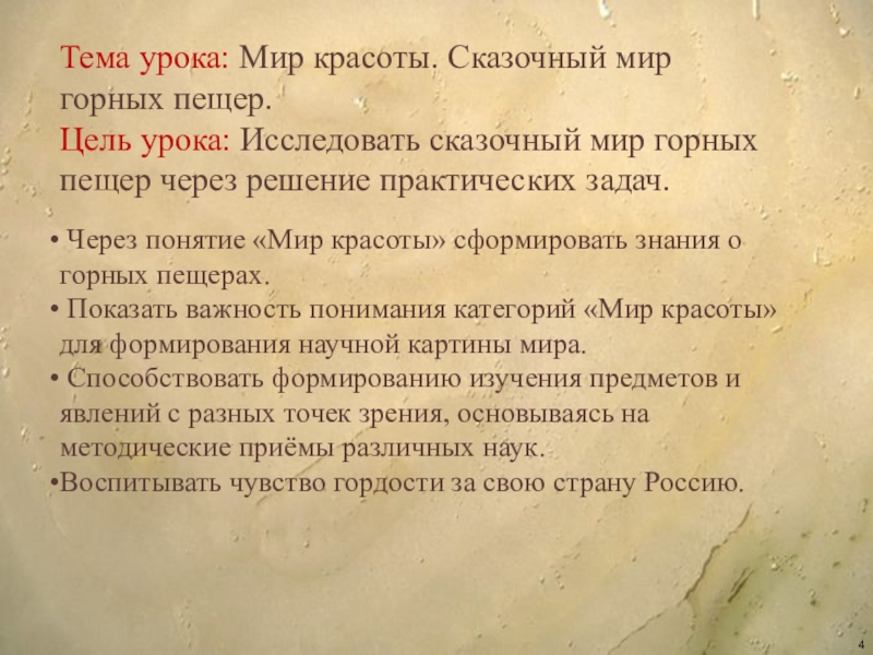 Через понятие «Мир красоты» сформировать знания о горных пещерах.