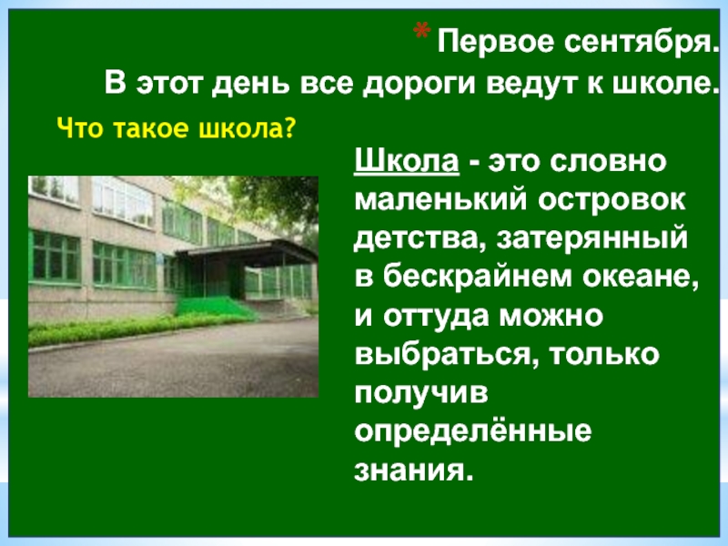 Школа - это словно маленький островок детства, затерянный в бескрайнем океане, и оттуда можно выбраться, только получив определённые знания.