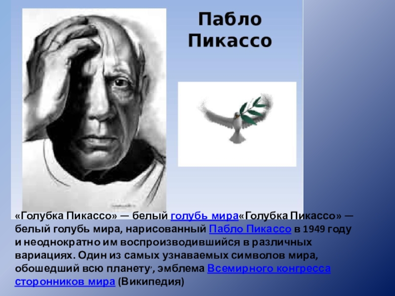 Слайд 18«Голубка Пикассо» — белый голубь мира«Голубка Пикассо» — белый голубь мира, нарисованный Пабло Пикассо в 1949 году