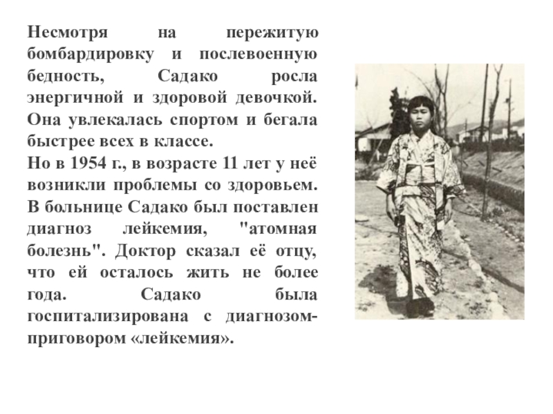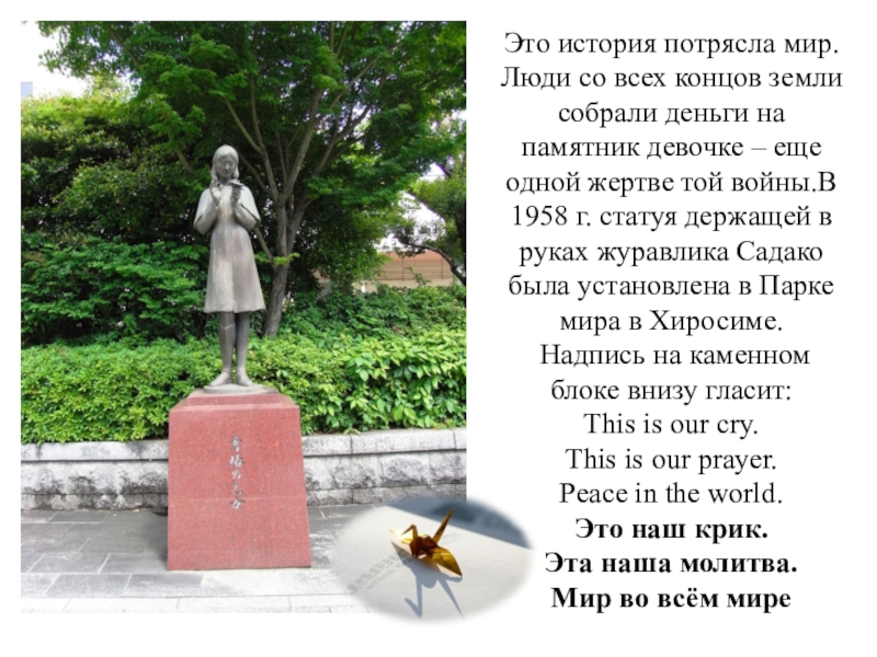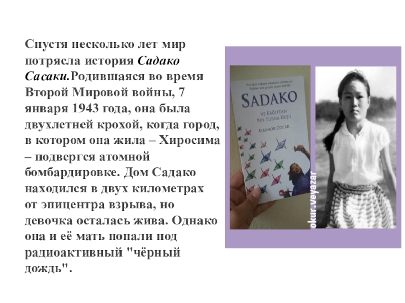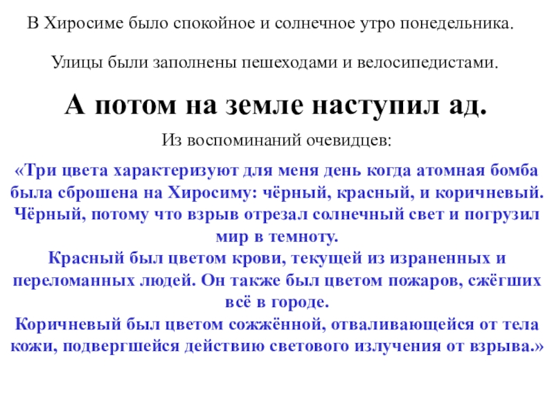 «Три цвета характеризуют для меня день когда атомная бомба была сброшена на Хиросиму: чёрный, красный, и коричневый.