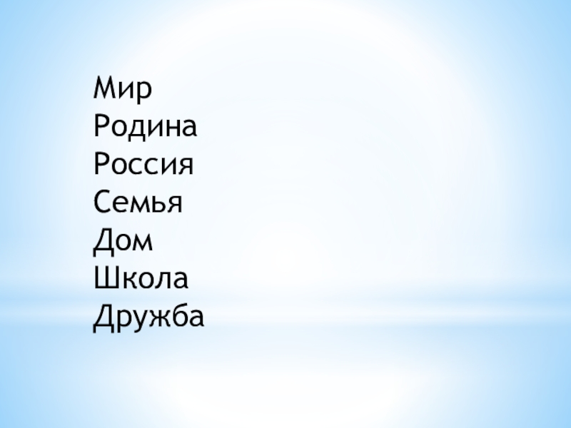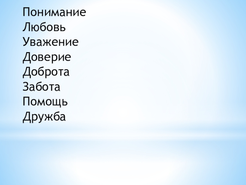 ПониманиеЛюбовьУважениеДовериеДоброта ЗаботаПомощьДружба