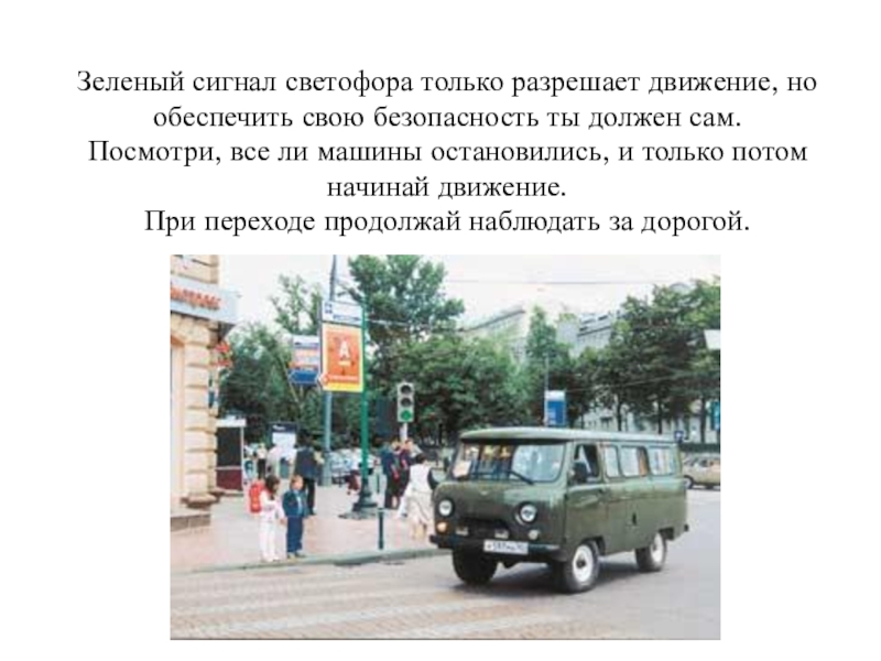 Зеленый сигнал светофора только разрешает движение, но обеспечить свою безопасность ты должен сам.Посмотри, все ли машины остановились,