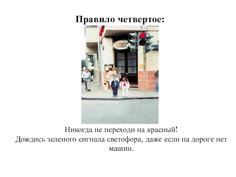 Правило четвертое:Никогда не переходи на красный!Дождись зеленого сигнала светофора, даже если на дороге нет машин.