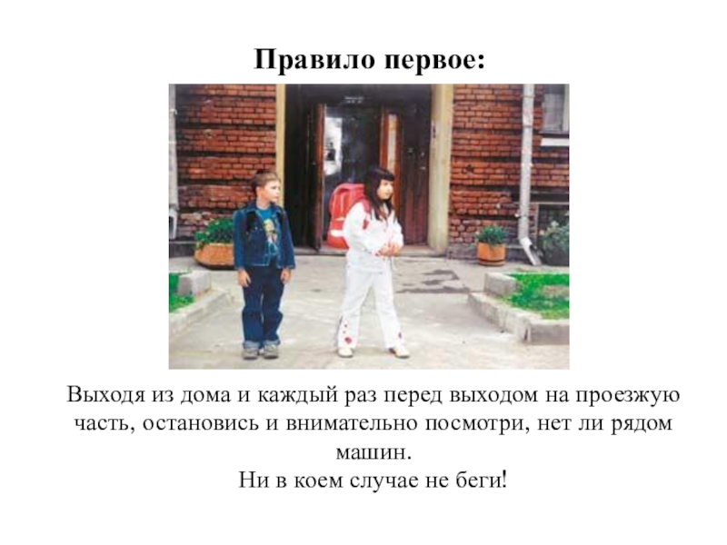 Правило первое:Выходя из дома и каждый раз перед выходом на проезжую часть, остановись и внимательно посмотри, нет