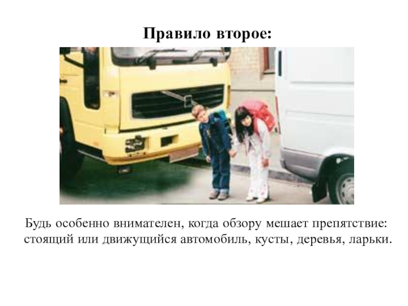Правило второе:Будь особенно внимателен, когда обзору мешает препятствие: стоящий или движущийся автомобиль, кусты, деревья, ларьки.