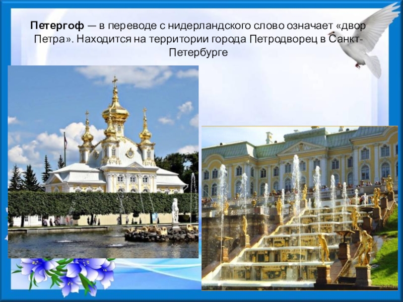 Слайд 10Петергоф — в переводе с нидерландского слово означает «двор Петра». Находится на