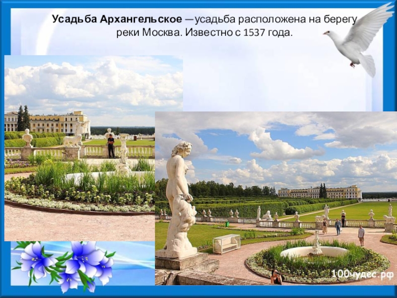 Слайд 11Усадьба Архангельское —усадьба расположена на берегу реки Москва. Известно с 1537 года.