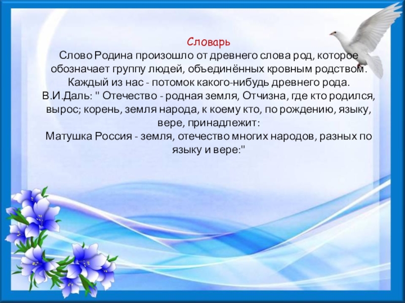 В.И.Даль: " Отечество - родная земля, Отчизна, где кто родился, вырос; корень, земля народа, к коему кто, по рождению, языку, вере, принадлежит:
