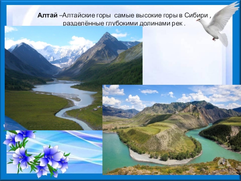 Слайд 7Алтай –Алтайские горы самые высокие горы в Сибири , разделённые глубокими долинами