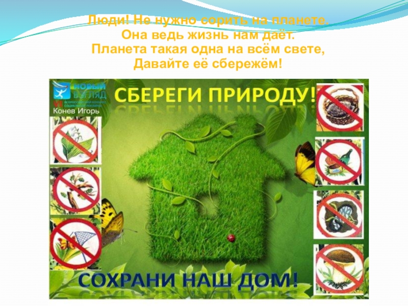 Люди! Не нужно сорить на планете.Она ведь жизнь нам даёт.Планета такая одна на всём свете,Давайте её сбережём!