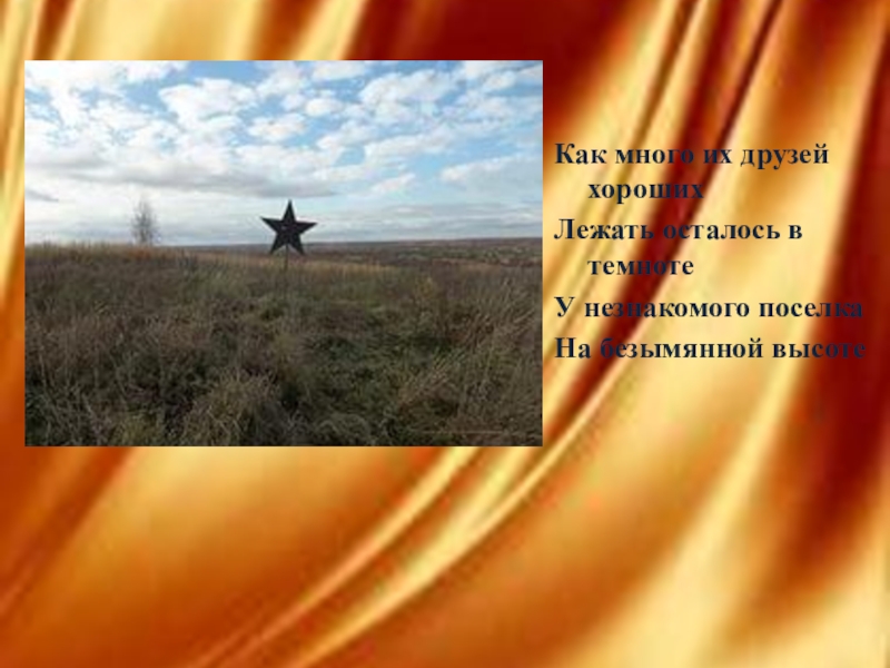 Как много их друзей хорошихЛежать осталось в темнотеУ незнакомого поселкаНа безымянной высоте