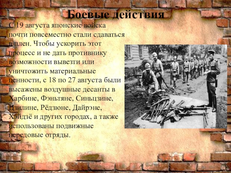 плен. Чтобы ускорить этот процесс и не дать противнику возможности вывезти или уничтожить материальные ценности, с 18 по 27 августа были высажены воздушные десанты в Харбине, Фэньтяне, Синьцзине, Цзилине, Рёдзюне, Дайрэне, Хэйдзё и других городах, а также использованы подвижные передовые отряды.