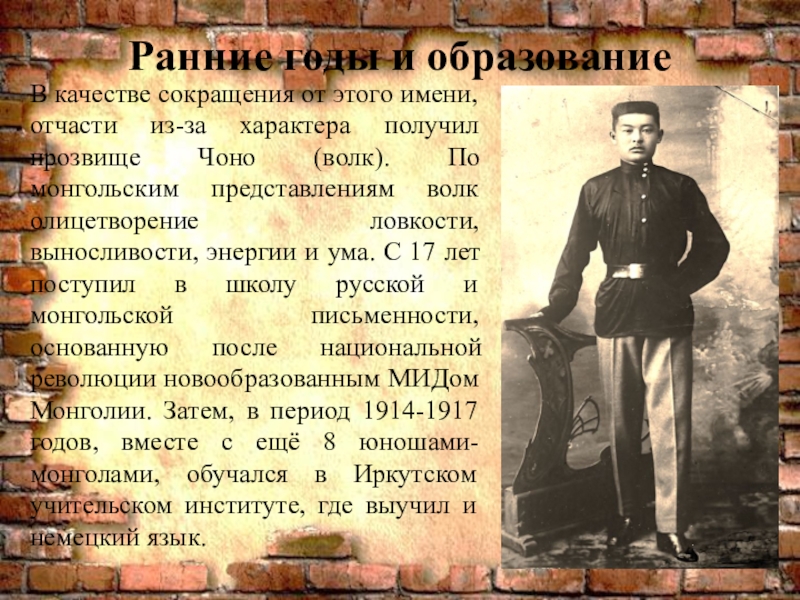 характера получил прозвище Чоно (волк). По монгольским представлениям волк олицетворение ловкости, выносливости, энергии и ума. С 17 лет поступил в школу русской и монгольской письменности, основанную после национальной революции новообразованным МИДом Монголии. Затем, в период 1914-1917 годов, вместе с ещё 8 юношами-монголами, обучался в Иркутском учительском институте, где выучил и немецкий язык.