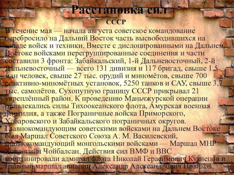 Дальний Восток часть высвободившихся на западе войск и техники. Вместе с дислоцированными на Дальнем Востоке войсками перегруппированные соединения и части составили 3 фронта: Забайкальский, 1-й Дальневосточный, 2-й Дальневосточный — всего 131 дивизия и 117 бригад, свыше 1,5 млн человек, свыше 27 тыс. орудий и миномётов, свыше 700 реактивно-миномётных установок, 5250 танков и САУ, свыше 3,7 тыс. самолётов. Сухопутную границу СССР прикрывал 21 укреплённый район. К проведению Маньчжурской операции привлекались силы Тихоокеанского флота, Амурская военная флотилия, а также Пограничные войска Приморского, Хабаровского и Забайкальского пограничных округов. Главнокомандующим советскими войсками на Дальнем Востоке был Маршал Советского Союза А. М. Василевский, главнокомандующий монгольскими войсками — Маршал МНР Хорлогийн Чойбалсан. Действия сил ВМФ и ВВС координировали адмирал флота Николай Герасимович Кузнецов и Главный маршал авиации Александр Александрович Новиков.