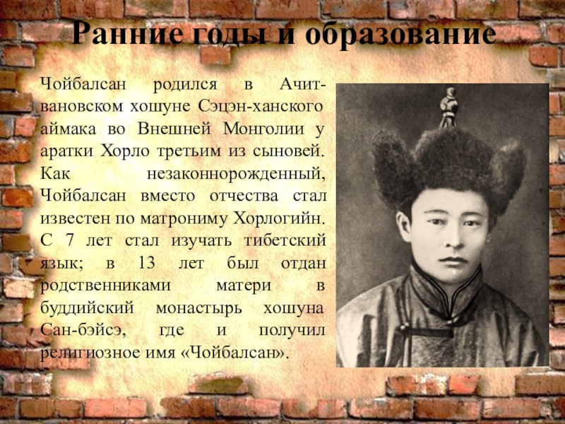 Чойбалсан родился в Ачит-вановском хошуне Сэцэн-ханского аймака во