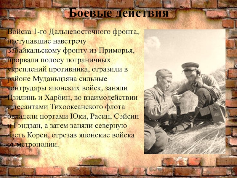 прорвали полосу пограничных укреплений противника, отразили в районе Муданьцзяна сильные контрудары японских войск, заняли Цзилинь и Харбин, во взаимодействии с десантами Тихоокеанского флота овладели портами Юки, Расин, Сэйсин и Гэндзан, а затем заняли северную часть Кореи, отрезав японские войска от метрополии.