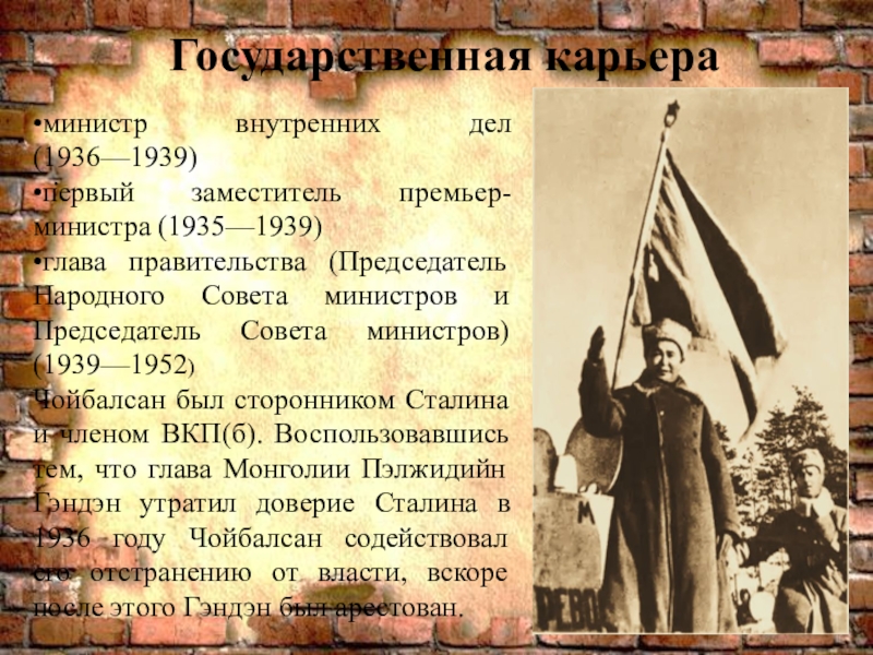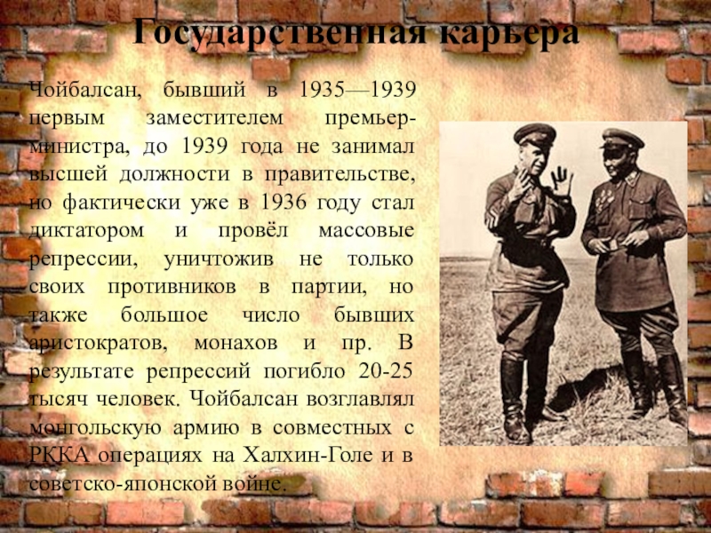 Чойбалсан, бывший в 1935—1939 первым заместителем премьер-министра, до 1939 года