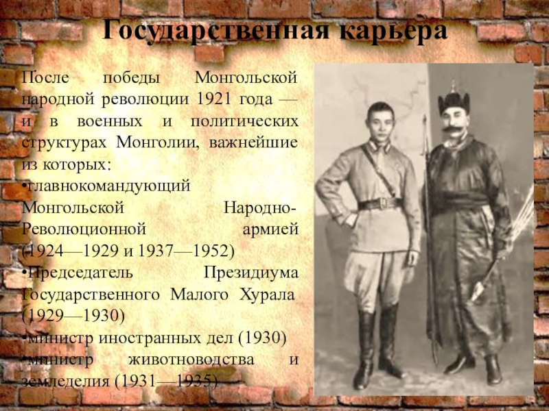 •главнокомандующий Монгольской Народно-Революционной армией (1924—1929 и 1937—1952)