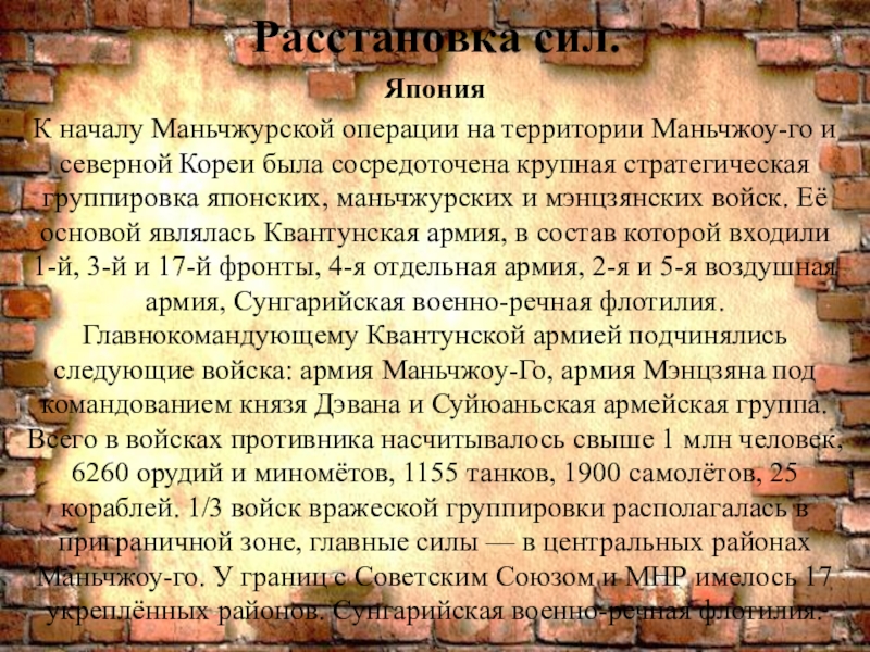 была сосредоточена крупная стратегическая группировка японских, маньчжурских и мэнцзянских войск. Её основой являлась Квантунская армия, в состав которой входили 1-й, 3-й и 17-й фронты, 4-я отдельная армия, 2-я и 5-я воздушная армия, Сунгарийская военно-речная флотилия. Главнокомандующему Квантунской армией подчинялись следующие войска: армия Маньчжоу-Го, армия Мэнцзяна под командованием князя Дэвана и Суйюаньская армейская группа. Всего в войсках противника насчитывалось свыше 1 млн человек, 6260 орудий и миномётов, 1155 танков, 1900 самолётов, 25 кораблей. 1/3 войск вражеской группировки располагалась в приграничной зоне, главные силы — в центральных районах Маньчжоу-го. У границ с Советским Союзом и МНР имелось 17 укреплённых районов. Сунгарийская военно-речная флотилия.