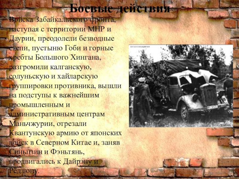 безводные степи, пустыню Гоби и горные хребты Большого Хингана, разгромили калганскую, солуньскую и хайларскую группировки противника, вышли на подступы к важнейшим промышленным и административным центрам Маньчжурии, отрезали Квантунскую армию от японских войск в Северном Китае и, заняв Синьцзин и Фэньтянь, продвигались к Дайрэну и Рёдзюну.