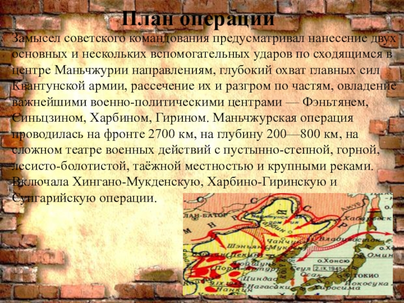 ударов по сходящимся в центре Маньчжурии направлениям, глубокий охват главных сил Квантунской армии, рассечение их и разгром по частям, овладение важнейшими военно-политическими центрами — Фэньтянем, Синьцзином, Харбином, Гирином. Маньчжурская операция проводилась на фронте 2700 км, на глубину 200—800 км, на сложном театре военных действий с пустынно-степной, горной, лесисто-болотистой, таёжной местностью и крупными реками. Включала Хингано-Мукденскую, Харбино-Гиринскую и Сунгарийскую операции.