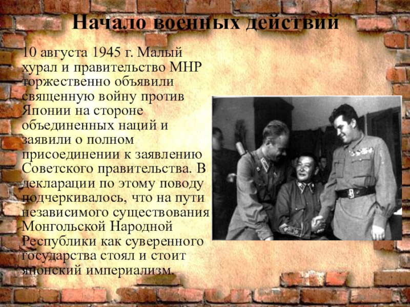 торжественно объявили священную войну против Японии на стороне объединенных наций и заявили о полном присоединении к заявлению Советского правительства. В декларации по этому поводу подчеркивалось, что на пути независимого существования Монгольской Народной Республики как суверенного государства стоял и стоит японский империализм.