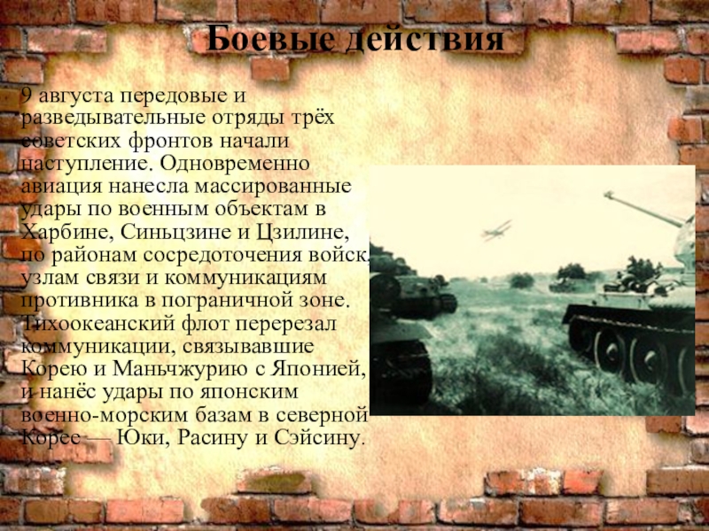наступление. Одновременно авиация нанесла массированные удары по военным объектам в Харбине, Синьцзине и Цзилине, по районам сосредоточения войск, узлам связи и коммуникациям противника в пограничной зоне. Тихоокеанский флот перерезал коммуникации, связывавшие Корею и Маньчжурию с Японией, и нанёс удары по японским военно-морским базам в северной Корее — Юки, Расину и Сэйсину.