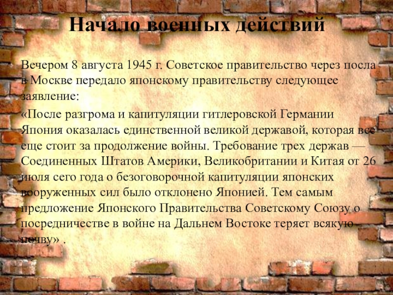 «После разгрома и капитуляции гитлеровской Германии Япония оказалась единственной великой державой, которая все еще стоит за продолжение войны. Требование трех держав — Соединенных Штатов Америки, Великобритании и Китая от 26 июля сего года о безоговорочной капитуляции японских вооруженных сил было отклонено Японией. Тем самым предложение Японского Правительства Советскому Союзу о посредничестве в войне на Дальнем Востоке теряет всякую почву» .