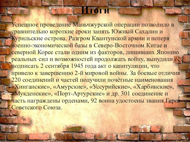 Сахалин и Курильские острова. Разгром Квантунской армии и потеря военно-экономической базы в Северо-Восточном Китае и северной Корее стали одним из факторов, лишивших Японию реальных сил и возможностей продолжать войну, вынудили её подписать 2 сентября 1945 года акт о капитуляции, что привело к завершению 2-й мировой войны. За боевые отличия 220 соединений и частей получили почётные наименования «Хинганские», «Амурские», «Уссурийские», «Харбинские», «Мукденские», «Порт-Артурские» и др. 301 соединение и часть награждены орденами, 92 воина удостоены звания Героя Советского Союза.