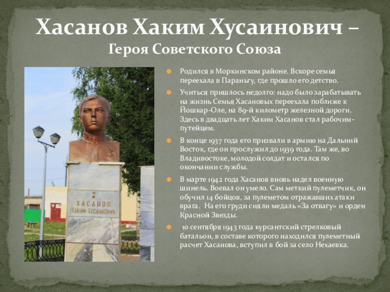 Учиться пришлось недолго: надо было зарабатывать на жизнь Семья Хасановых переехала поближе к Йошкар-Оле, на 89-й километр железной дороги. Здесь в двадцать лет Хаким Хасанов стал рабочим-путейцем.