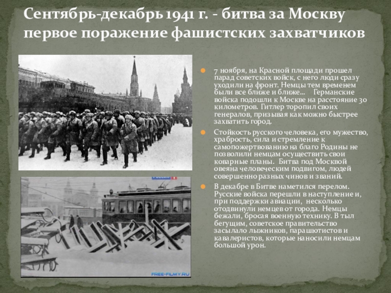 на Красной площади прошел парад советских войск, с него люди сразу уходили на фронт. Немцы тем временем были все ближе и ближе… Германские войска подошли к Москве на расстояние 30 километров. Гитлер торопил своих генералов, призывая как можно быстрее захватить город.