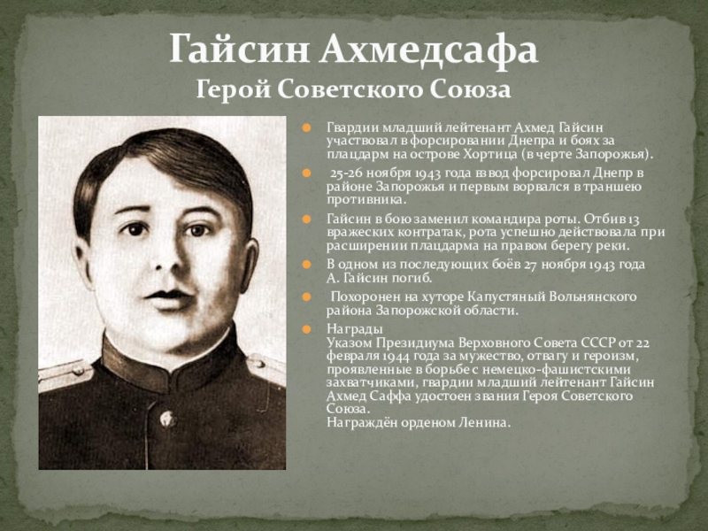 Гвардии младший лейтенант Ахмед Гайсин участвовал в форсировании