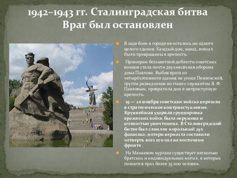 На Мамаевом кургане существует несколько братских и индивидуальных могил, в которых покоится прах более 35 000 человек.