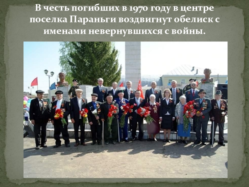 Слайд 3В честь погибших в 1970 году в центре поселка Параньги воздвигнут