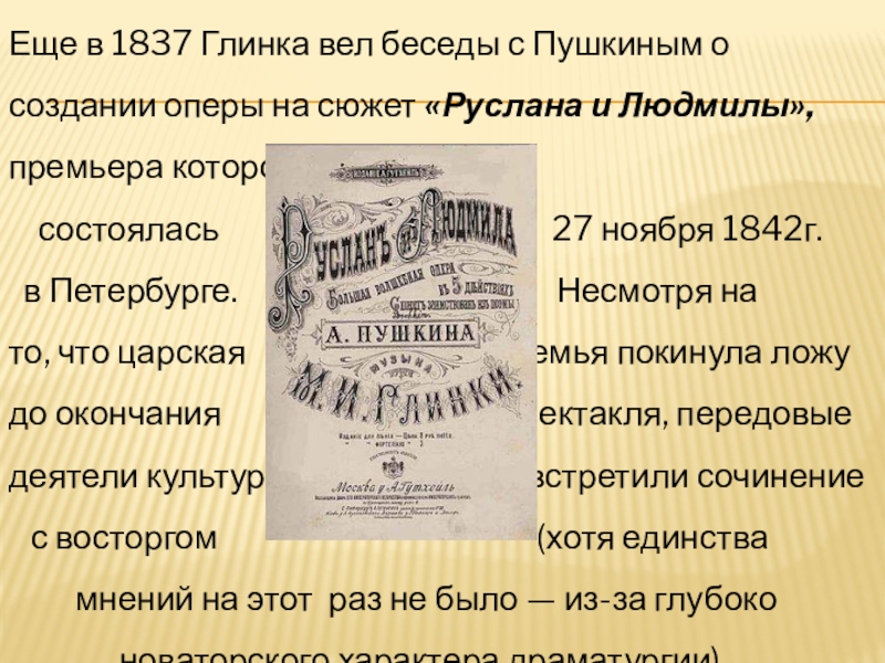 Слайд 11Еще в 1837 Глинка вел беседы с Пушкиным о создании оперы