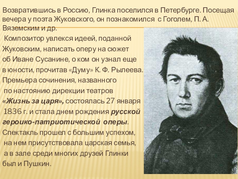 Возвратившись в Россию, Глинка поселился в Петербурге. Посещая вечера у поэта