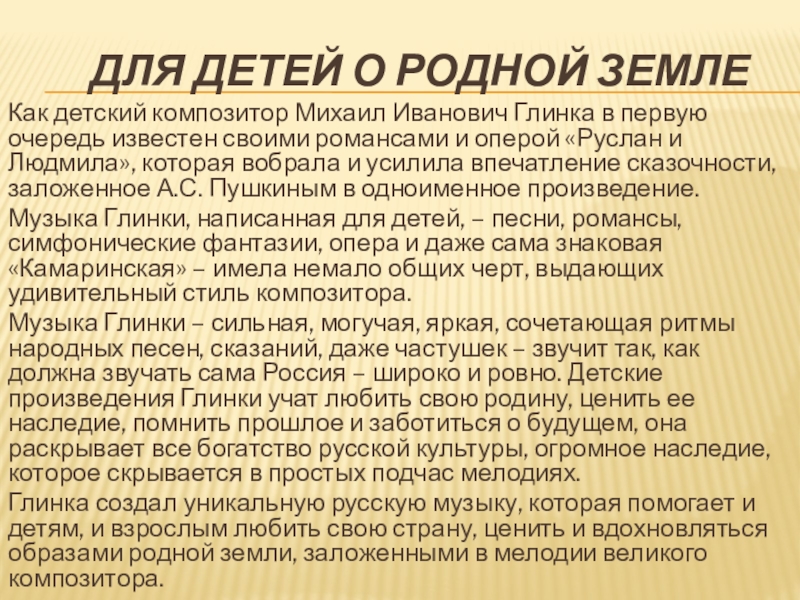 Музыка Глинки – сильная, могучая, яркая, сочетающая ритмы народных песен, сказаний, даже частушек – звучит так, как должна звучать сама Россия – широко и ровно. Детские произведения Глинки учат любить свою родину, ценить ее наследие, помнить прошлое и заботиться о будущем, она раскрывает все богатство русской культуры, огромное наследие, которое скрывается в простых подчас мелодиях.