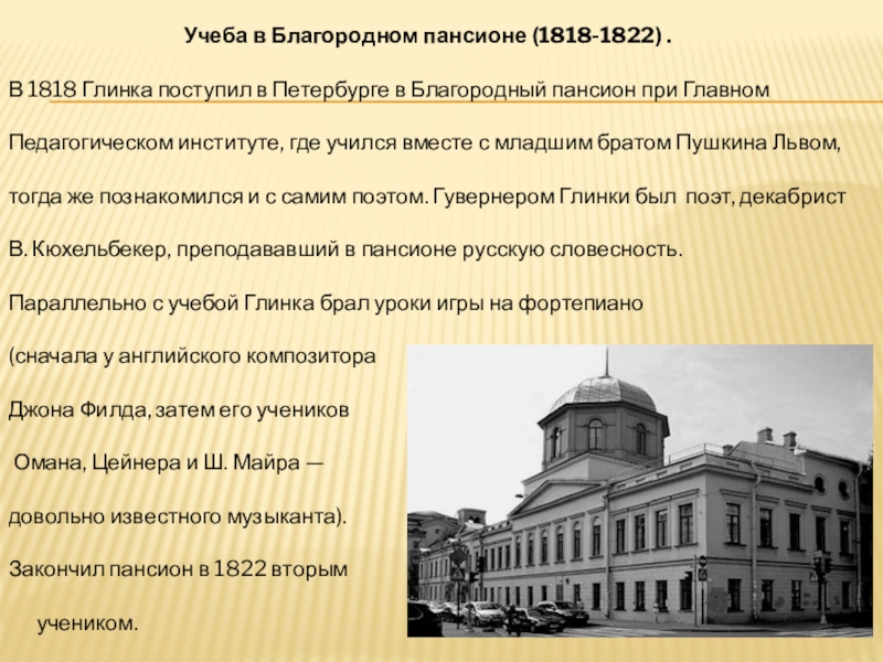 в Благородный пансион при Главном Педагогическом институте, где учился вместе с младшим братом Пушкина Львом, тогда же познакомился и с самим поэтом. Гувернером Глинки был поэт, декабрист В. Кюхельбекер, преподававший в пансионе русскую словесность.