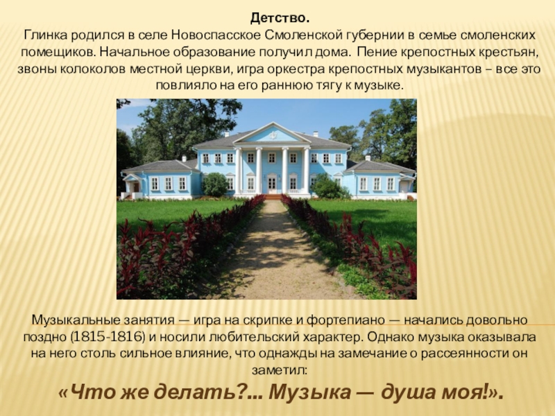 Глинка родился в селе Новоспасское Смоленской губернии в семье смоленских помещиков.