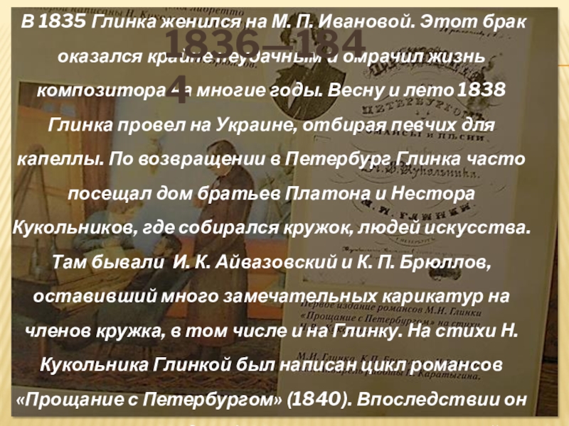 оказался крайне неудачным и омрачил жизнь композитора на многие годы. Весну и лето 1838 Глинка провел на Украине, отбирая певчих для капеллы. По возвращении в Петербург Глинка часто посещал дом братьев Платона и Нестора Кукольников, где собирался кружок, людей искусства. Там бывали И. К. Айвазовский и К. П. Брюллов, оставивший много замечательных карикатур на членов кружка, в том числе и на Глинку. На стихи Н. Кукольника Глинкой был написан цикл романсов «Прощание с Петербургом» (1840). Впоследствии он переселился в дом братьев из-за невыносимой домашней атмосферы.