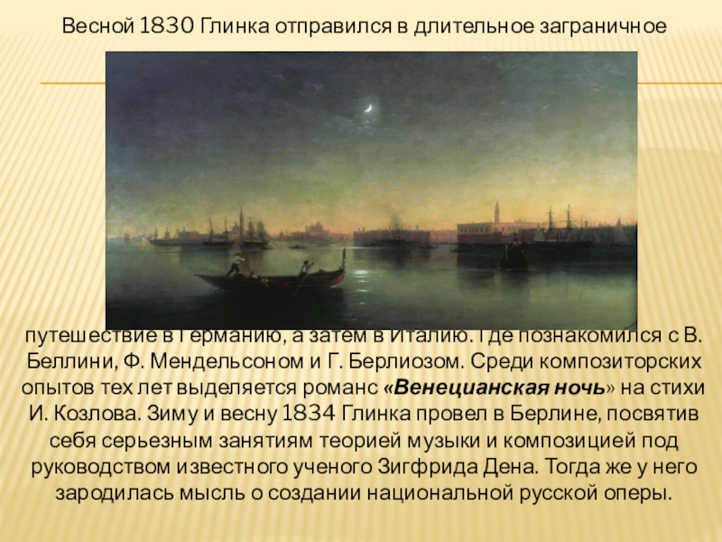 затем в Италию. Где познакомился с В. Беллини, Ф. Мендельсоном и Г. Берлиозом. Среди композиторских опытов тех лет выделяется романс «Венецианская ночь» на стихи И. Козлова. Зиму и весну 1834 Глинка провел в Берлине, посвятив себя серьезным занятиям теорией музыки и композицией под руководством известного ученого Зигфрида Дена. Тогда же у него зародилась мысль о создании национальной русской оперы.
