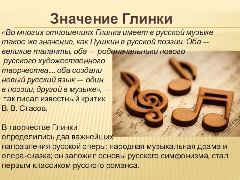 отношениях Глинка имеет в русской музыке такое же значение, как Пушкин в русской поэзии. Оба — великие таланты, оба — родоначальники нового