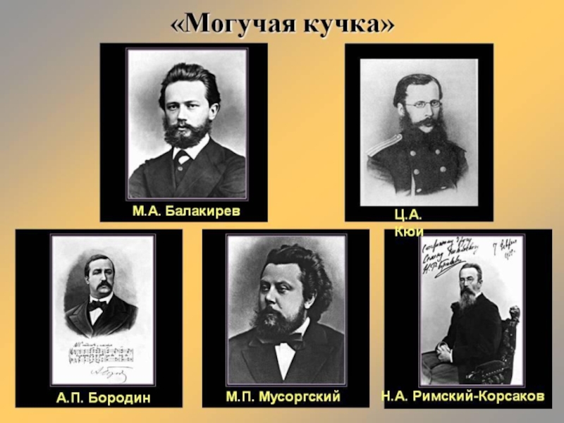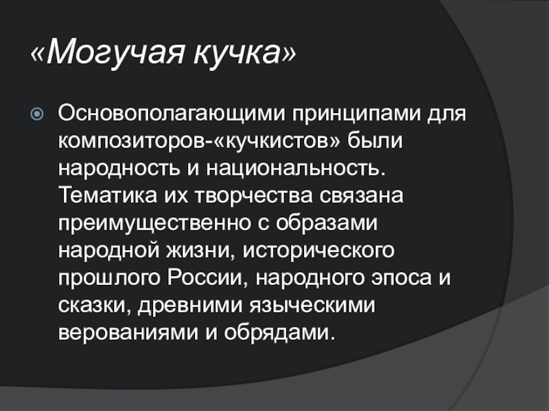 «Могучая кучка»Основополагающими принципами для композиторов-«кучкистов» были народность и национальность. Тематика их творчества связана преимущественно с образами народной